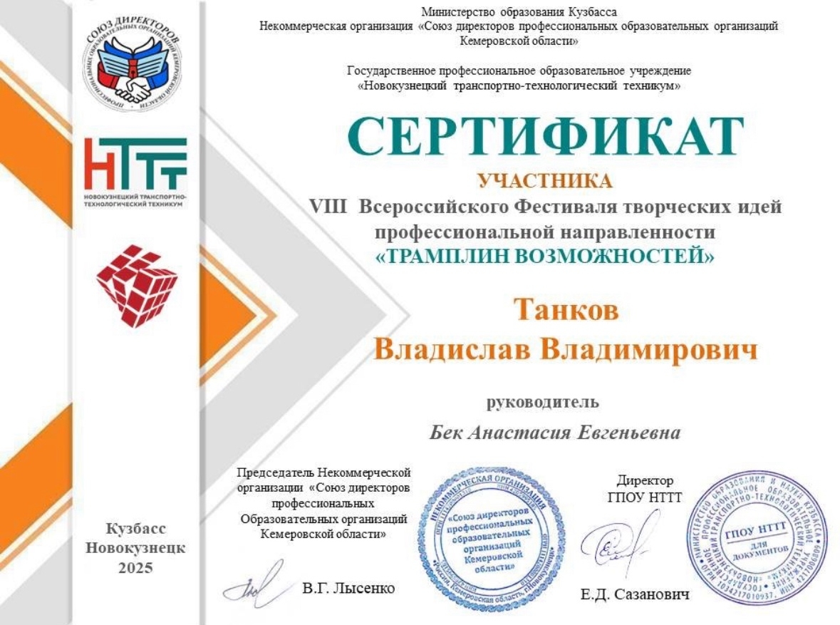 Сертификатом участника награжден Танков Владислав.